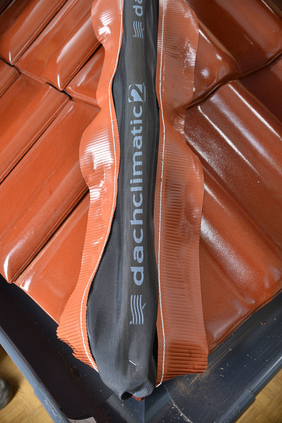 7,5 cm genişliğindeki esnek dalgalı motif alüminyum kenarlıklar ile mahya kiremitinin daha geniş yüzeyinin kaplanabilmesi amaçlanmıştır.